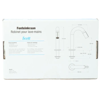 De Atlantic fonteinkraan Scott met draaiknop RVS bestaat uit een RVS fonteinkraan van 17,8 cm hoog, bevestigingsmateriaal en montagehandleiding. De kraan heeft een diepte van slechts 11,2 cm en is daarmee uitermate geschikt voor gebruik in het toilet. De Scott fonteinkraan zet je open met de draaiknop op het uiteinde van de kraanuitloop. Aan de anti-kalk perlator hecht kalk zich moeilijk vast en veeg je er gemakkelijk met de hand af. De ronde c-vormige kraan heeft een geborstelde RVS afwerking. Gebruik alleen water en een zachte doek om de kraan schoon te maken. Gebruik geen schurend, bijtend, azijnhoudend of agressief schoonmaakmiddel. Op de kraan heb je 5 jaar garantie.